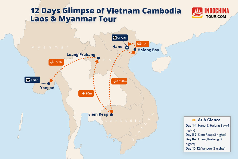 You will start the tour from Yangon and have a highlight tour there. Then visit Bagan and have a hot air balloon tour over the temples. And in Vietnam, You will spend days in Hanoi and have a nice city highlight tour. You will also have a fantastic Halong Bay tour. Then go to Laos and have a temple tour in Vientiane and Luang Prabang. At the end of this tour, visit Siem Reap Cambodia and discover the Angkor Wat.