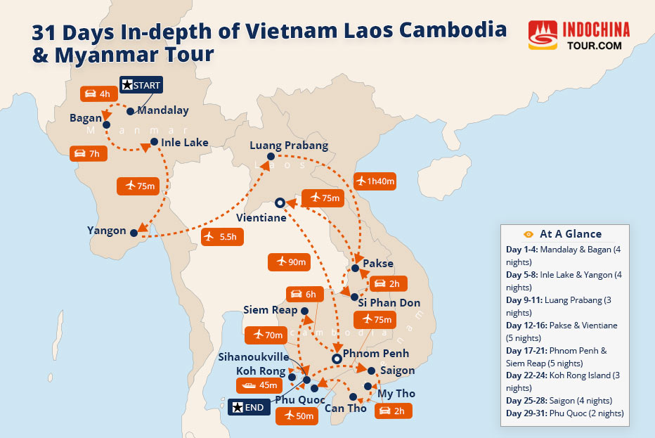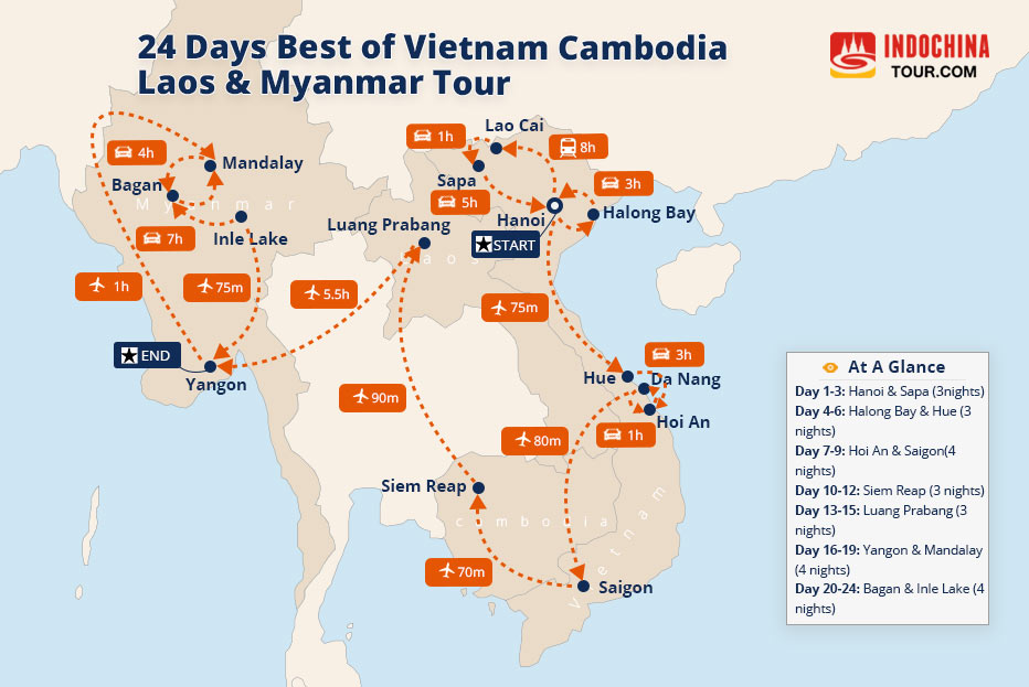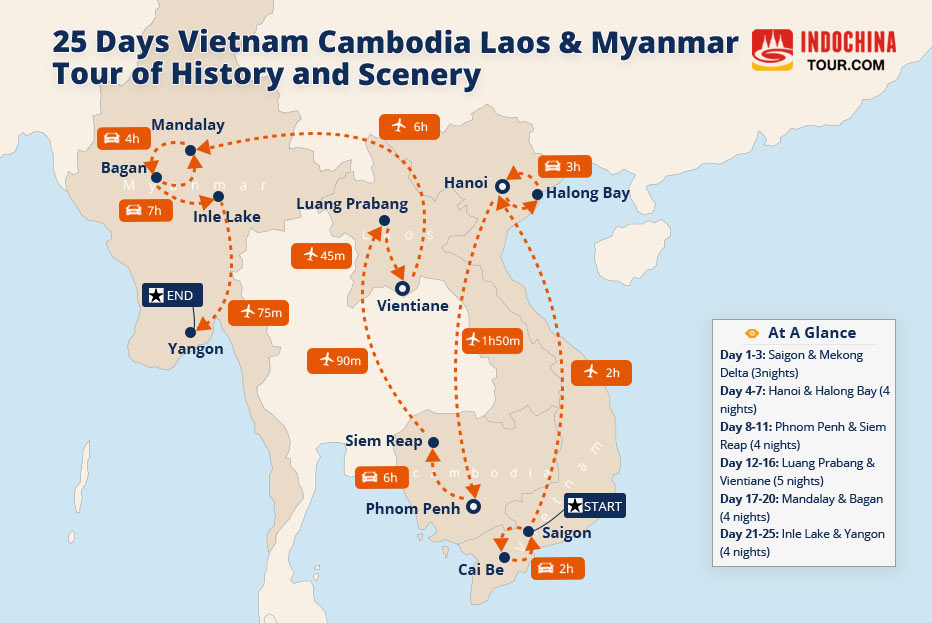 The 20-days tour will cover the classic destinations and attractions in Myanmar Vietnam Laos Cambodia.