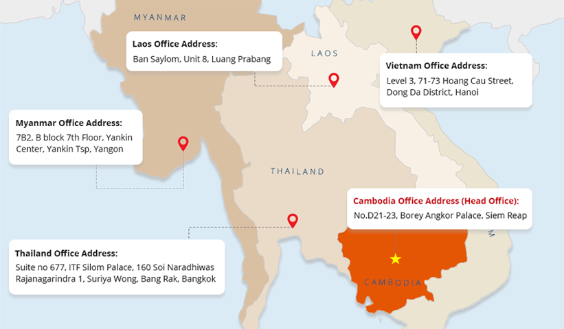 Our head office is located in Siem Reap, Cambodia, and we have branches in Thailand, Vietnam, Laos, and Myanmar. Feel free to have a visit if you encounter any issues during your journey!