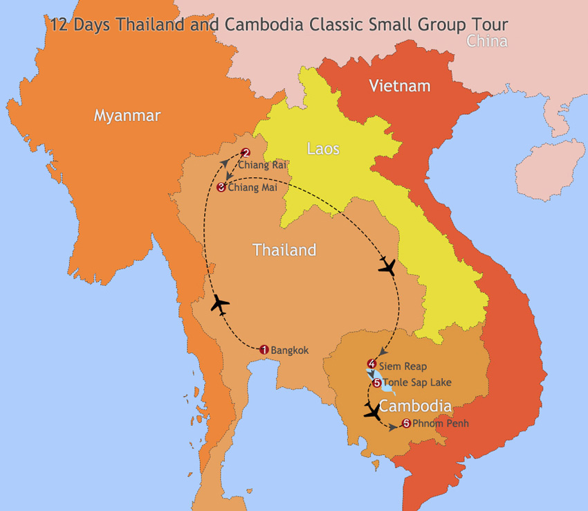 Your will start in Bangkok, and take in the Wat Pho Temple, then visit the Royal Palace and cruise the Chao Phraya River. Then head north to Chiang Rai to discover the Golden Triangle and take in the unique experience of visiting two of the ancient hill tribes. After touring around Chiang Mai, you will fly to Siem Reap, the gateway to Angkor, and visit the of Angkor Wat, the center of the Angkor Temple Complex that was once the capital of the ancient Khmer Empire. After visiting beautiful Tonle Sap Lake, you will head south to the Cambodian capital of Phnom Penh, and take in the beautiful sights of the city.