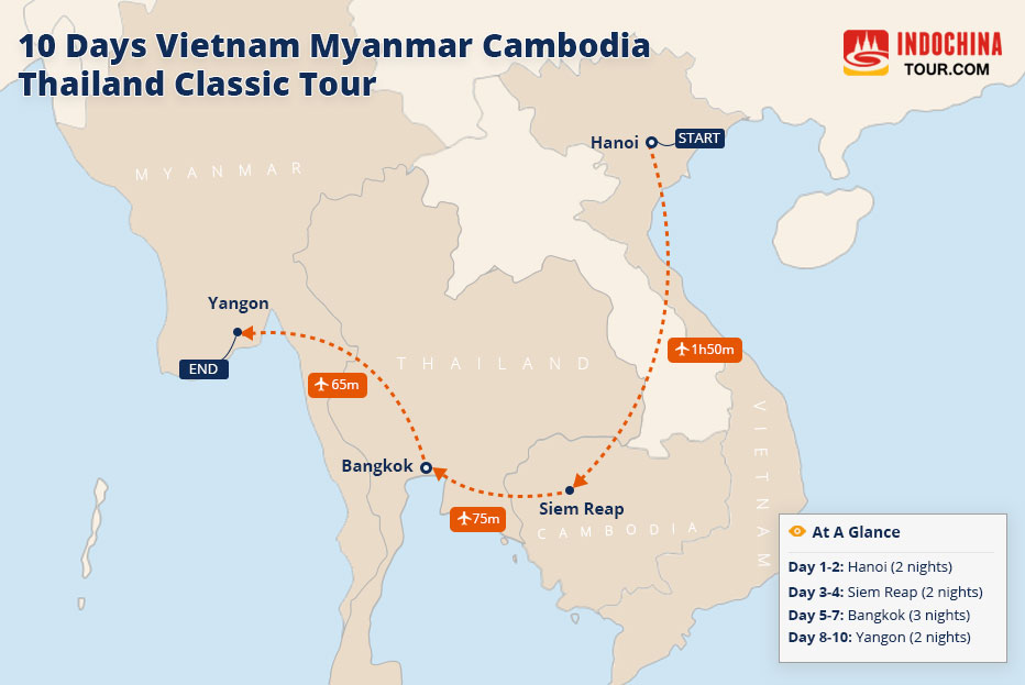 Tour Route: Hanoi – Siem Reap – Bangkok - Yangon View Map