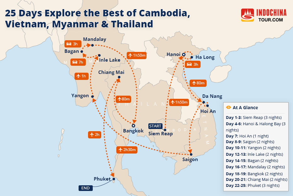 Tour Route: Siem Reap – Hanoi – Halong Bay Cruise – Hoi An – Saigon – Yangon – Inle Lake – Bagan – Mandalay – Bangkok – Chiang Mai – Phuket View Map