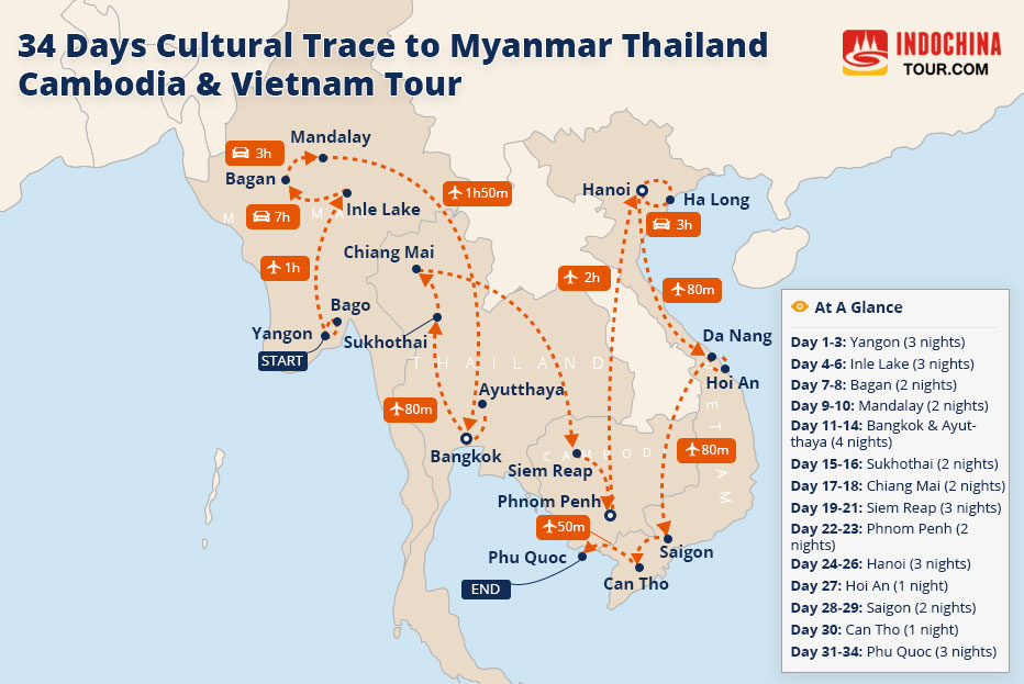 Tour Route: Yangon – Bago – Inle Lake – Bagan – Mandalay - Bangkok – Ayutthaya – Sukhothai – Chiang Mai – Siem Reap – Phnom Penh - Hanoi – Halong Bay Cruise – Hoi An – Saigon – Mekong Delta – Can Tho – Phu Quoc View Map
