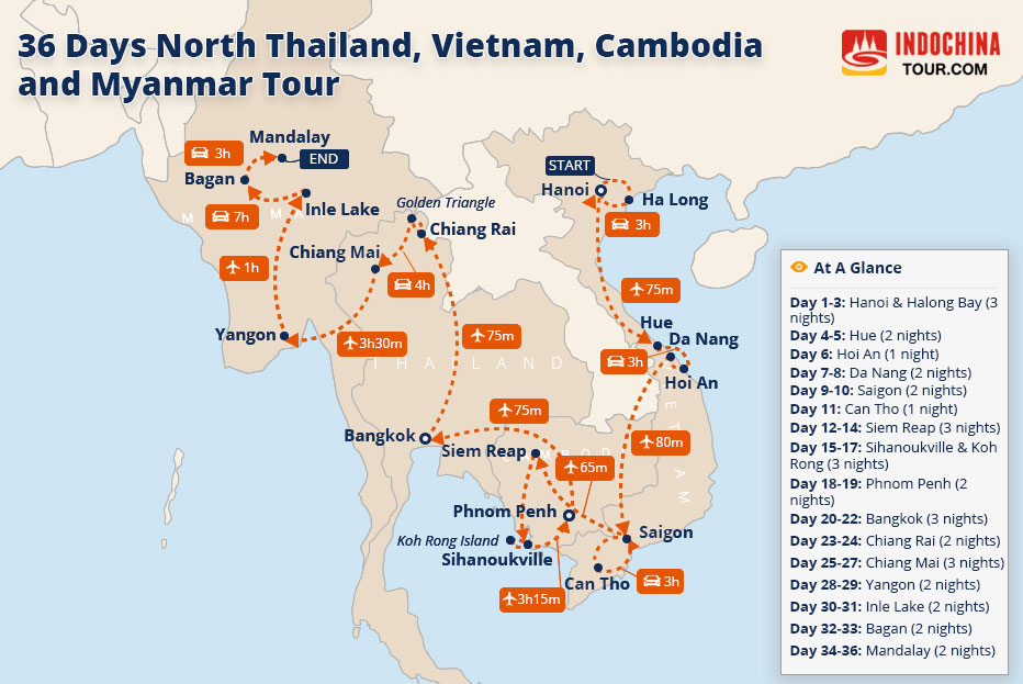 Tour Route: Hanoi – Halong Bay – Hue – Hoi An – Da Nang - Saigon – Mekong Delta - Siem Reap – Sihanoukville - Koh Rong Island - Phnom Penh – Bangkok – Chiang Rai – Golden Triangle – Chiang Mai – Yangon – Inle Lake – Bagan - Mandalay View Map